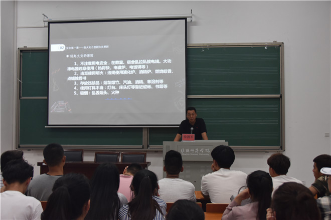 徐处长分别向新生们讲解了防火、防诈骗以及注意交通安全知识。他从校园火灾的危害性及典型案例、发生火灾的原因、火场疏散逃生、灭火设施的使用和维护对消防安全进行了介绍并就高校诈骗案件发案情况以及诈骗高发的成因,希望大家树立起防范意识、亲自核实或向公安机关报警求助甄别汇款情况、杜绝占便宜的心理;通过分析真实事故、典型交通案例,希望大家珍爱生命、安全出行。