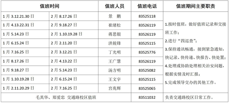 保卫处2025年1-2月份校园“110”值班室干部值班表