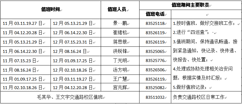 保卫处2023年11-12月份校园“110”值班室干部值班表