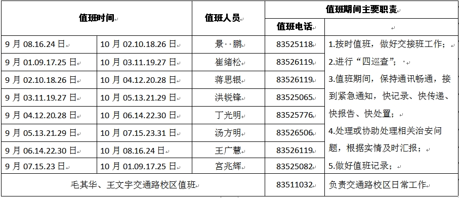 保卫处2023年9-10月份校园“110”值班室干部值班表