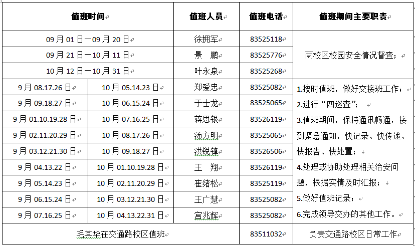 保卫处2021年09-10月份校园 “110”值班室干部值班表