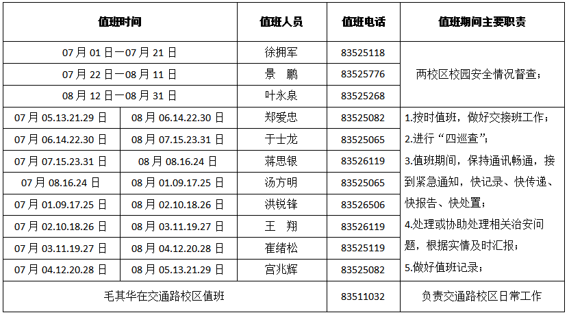 保卫处2021年07-08月份校园 “110”值班室干部值班表