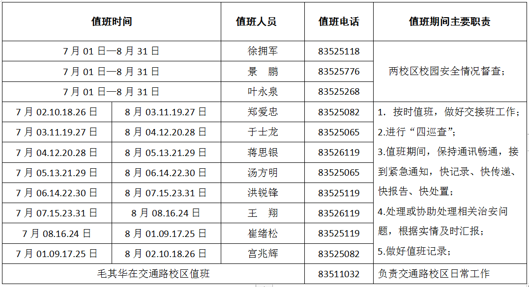 保卫处2020年7-8月份校园 “110”值班室干部值班表