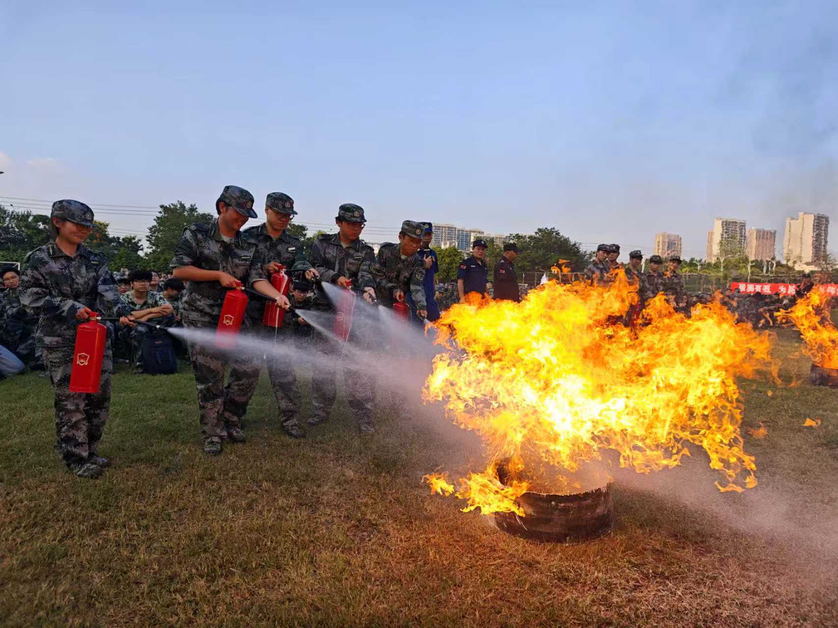 在灭火演练环节,参与演练的新生们在消防员的专业指导下,迅速进入演练状态。他们认真判断风向,准确选取最佳灭火位置,依照所学的操作方法,果断按下灭火器握把,对准火源根部进行全力喷射,火势迅速得到控制并最终被成功扑灭。通过此次演练,同学们进一步巩固了所学的消防知识,有效提升了应对初期火灾的能力。