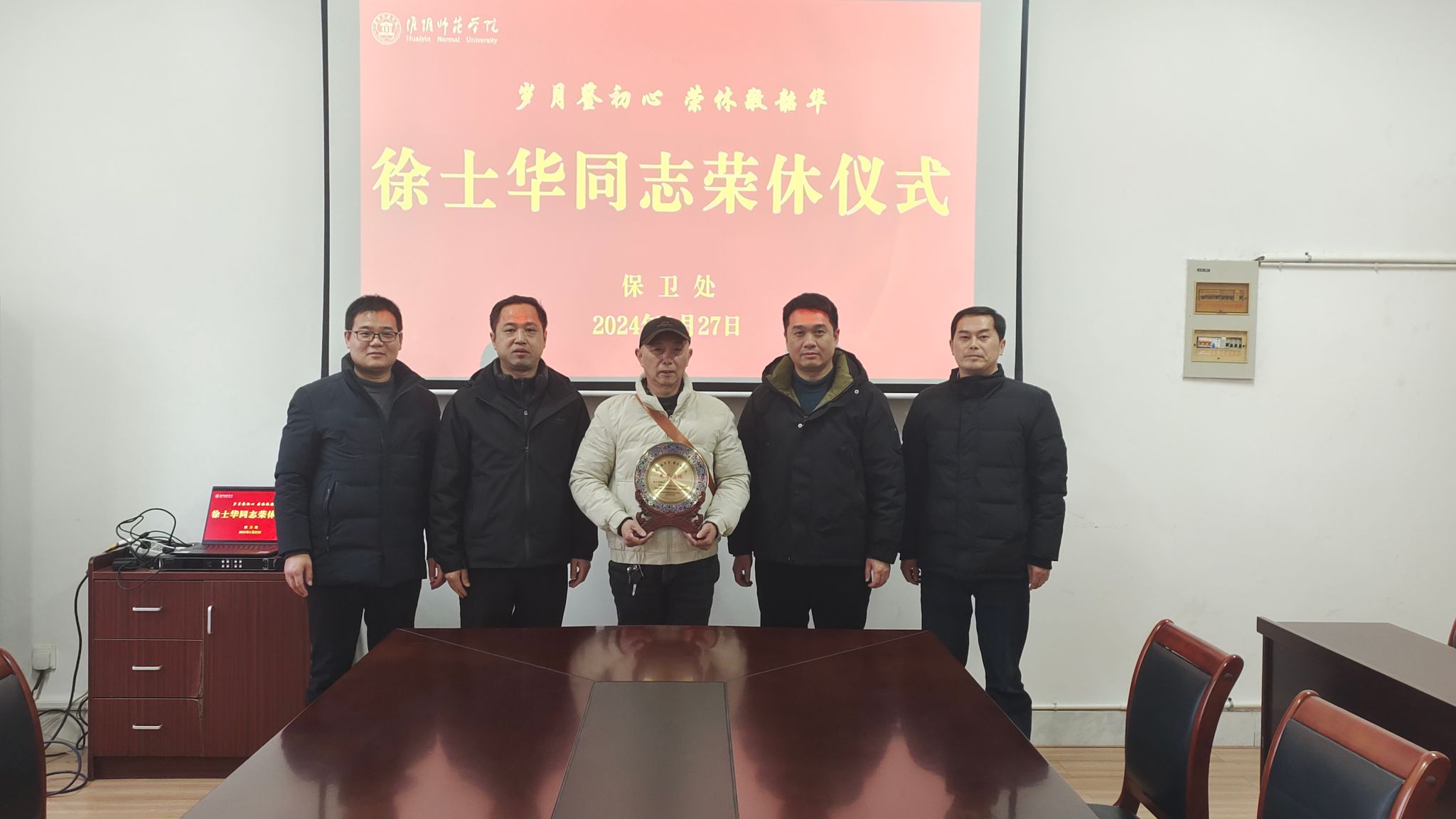 景鹏代表党委保卫部、保卫处感谢徐士华同志在岗43年来为学校发展和保卫处工作做出的贡献,祝福其退休后生活多姿多彩,希望离岗不离心,离开不离情,?;丶铱纯?,并为徐士华同志颁发了荣誉退休纪念品,与会人员一起合影留念。