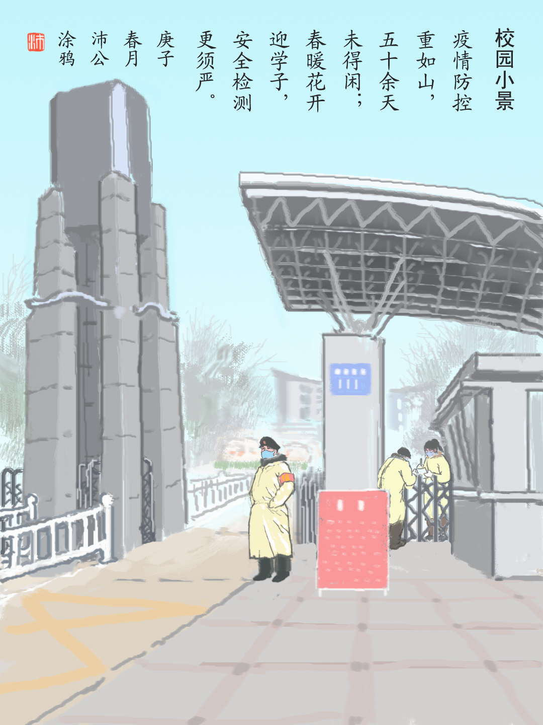 新春佳节,本是万家团圆时,安保人按照学校防控工作要求,第一时间落实安全管控措施,全面加强校门管理,加大执勤力量。安保队员春节坚守岗位,他们舍小家、为大家,用执着与奉献,守护宁静的校园,守在防控疫情的第一线。多少个日日夜夜,他们不畏严寒、不惧疫情,毅然坚守在岗位上,每天重复着校门值守、体温检测、查验登记等看似简单而又平凡的工作,全力以赴把好学校疫情防控第一道关卡,无私奉献,惊喜季节更迭的美好,祈祷春满花枝,师生欢喜返校,各自无恙。
