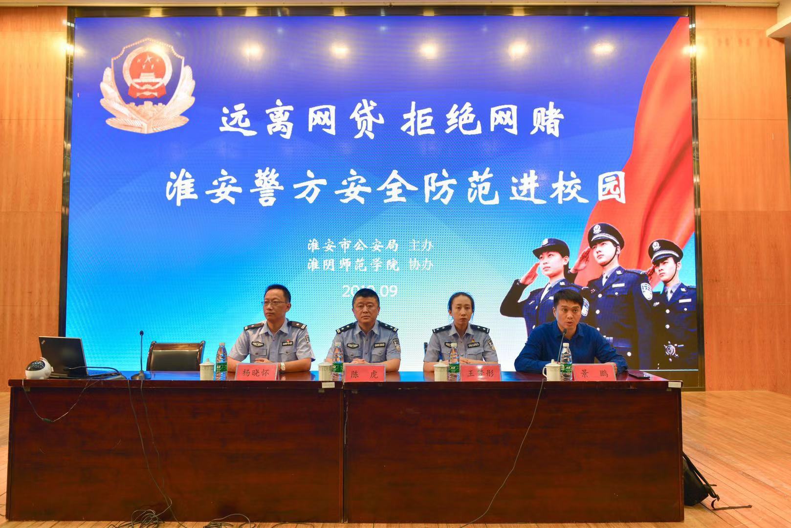 9月24日下午,淮安市公安局主办,淮阴师范学院协办的“淮安警方安全防范进校园”宣传活动在我校图书馆多功能厅举行?;窗彩泄簿中挛胖行恼禄?、“网络神探”淮安市涟水县公安局治安大队副大队长杨晓怀、“百变警花”淮安市枚乘路派出所民警王梦彤走进校园为我校物电学院、计科学院、传媒学院200余名新生代表开展了一场别开生面的培训活动,培训会由保卫处副处长景鹏主持。